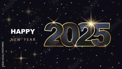 2025. New year 2025 black advertising poster or banner. New year 2025. New year promotion and shopping template. Elegant golden font, numbers. Business calendar cover, holiday vector illustration