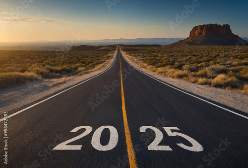 2025 road goals concept: a straight highway through the desert leading to future plans