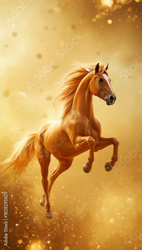 金色に輝く空飛ぶ馬が2026年の幸せな新年を高級感たっぷりに演出するラグジュアリー年賀グラフィック. 生成AI