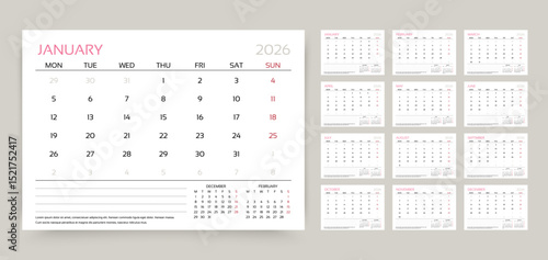 2026 calendar. Planner calender template. Yearly stationery organizer. Week starts Monday. Table schedule grid with 12 month. Corporate monthly diary layout. Vector illustration. Horizontal design