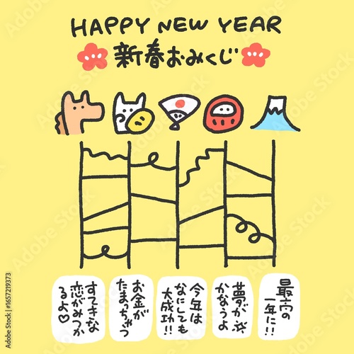 馬と日本の正月の手描きのかわいいあみだくじ年賀状 2026・おみくじ・正方形・SNS用・Instagram・LINE