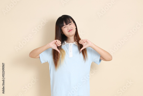 20s Asian Woman in Light Blue Shirt and White Shorts