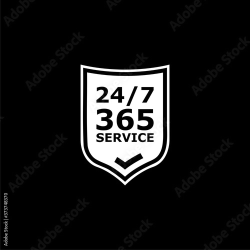 24 on 7 timing shield. Time 365 sign isolated on dark background