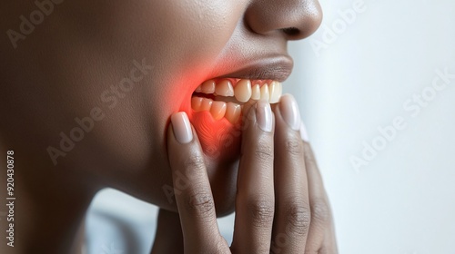 240805 58. Close-up of person clutching painful jaw in bedroom setting. Inflamed temporomandibular joint due to repetitive strain and excessive teeth clenching during sleep. Anatomical visualization