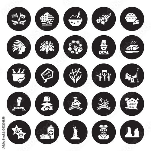 25 vector icon set : american civil war, Sheriff, Statue of liberty, Taco, Walk fame, Roasted turkey, crowd March, Veterans Day, Martin Luther King Day isolated on black background.