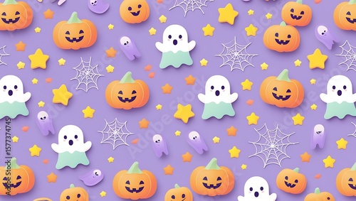 2D pastel pattern filled with repeating cute ghosts, pumpkins, candy, spider webs, and stars