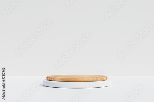 2step of Round wooden podium for food, products or cosmetics against bright brown background. 3d render