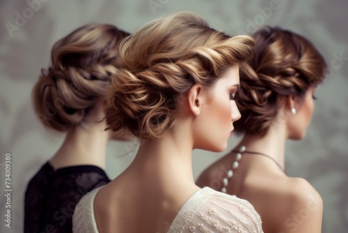 3 Frauen von hinten, die einen eleganten Hochzeitsfrisur mit eingearbeiteten Haaraccessoires trägt. Ihr Haar ist zu kunstvollen Locken aufgesteckt
