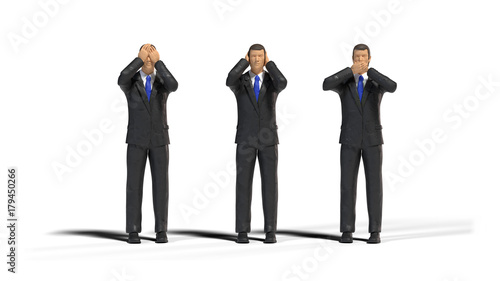 3 miniature figure businessmen in three wise monkeys pose isolated with shadow on white background (see no evil, hear no evil, speak no evil)