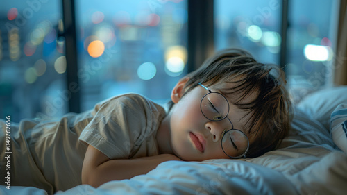 3 years old Japanese boy with glasses sleeping on a bed with prone sleeping pose,generative ai