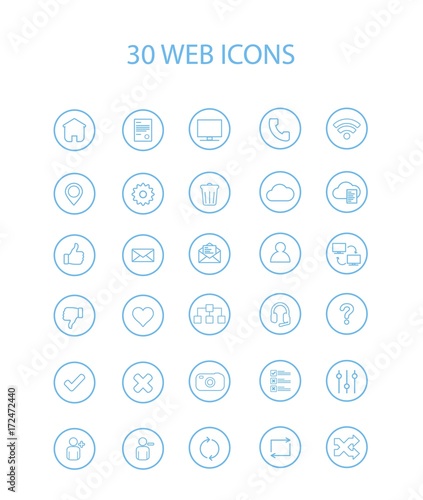 30 Blue Color Web Icons with Hollow Round, Vector, Illustration