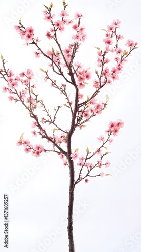 32. A single peach tree with pink blossoms and budding fruit on a white background