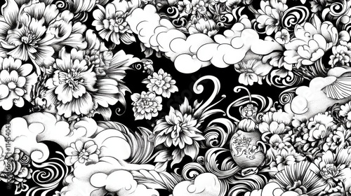 32.Collection of Asian-inspired decorative elements, including iconic symbols such as flowers, traditional lanterns, swirling cloud motifs, and ornate patterns; each element is drawn with detailed,
