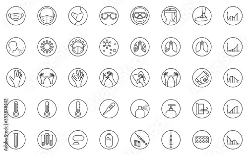 35 clear vector linear icons about healthcare and corona virus. Individual protection, healing, research, hygiene