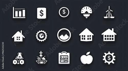 36. Pack of simple white icons in HD animation representing various aspects of an economic crisis, designed with a transparent background for seamless integration
