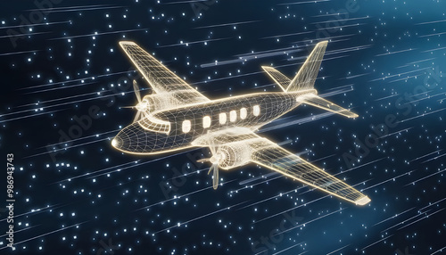 3d airplane isolated in dark blue. Abstract vector wireframe of airliner. Travel, tourism, business, airline transportation concept. Low poly glowing mesh with dots, lines, stars and flying particles.