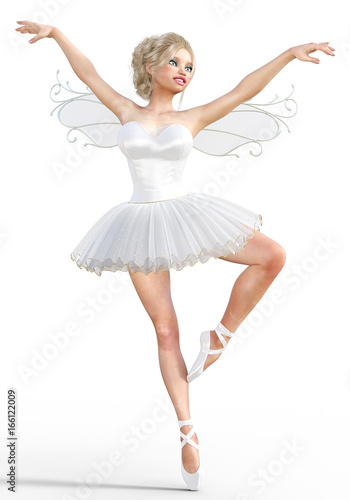 3D ballerina with wings. Forest Fairy. Butterfly. White ballet tutu. Blonde girl with blue eyes. Ballet dancer. Studio photography. High key. Conceptual fashion art. Render illustration.