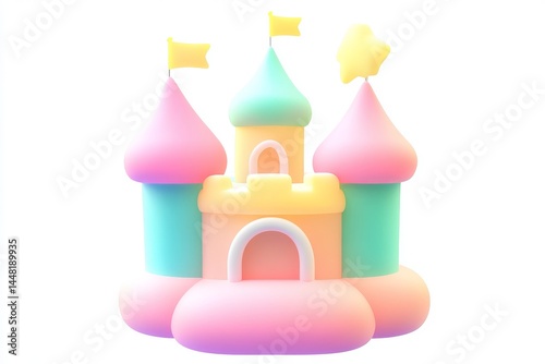 3D cartoon bouncy castle kingdom in neon pink and inflatable blue, ultra-high-definition details and 16K resolution, white background.