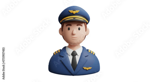 3D Cartoon Pilot Character in Blue Uniform with Cap and Tie.