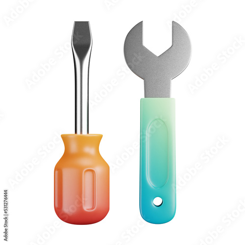 3D cartoon user interface illustration of a tools or screwdriver with wrench or equipment icon on an isolated background. With studio lighting and a gradient colourful texture. 3D rendering