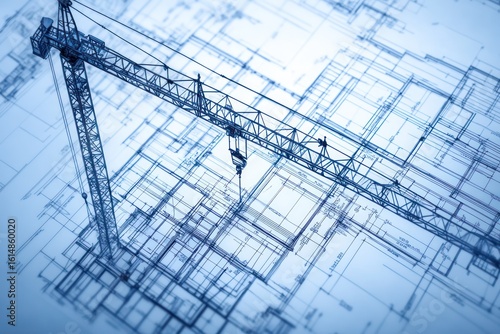 3D construction blueprint with crane in motion