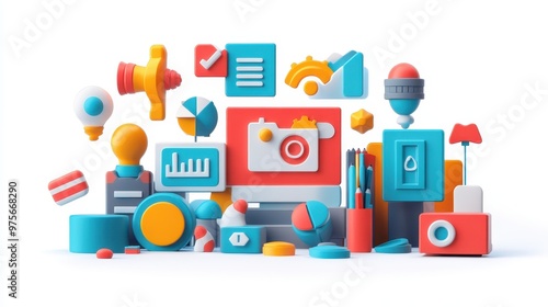3D digital marketing strategy with icons, corporate branding, clean layout, isolated on white background