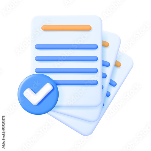 3D Document Icon with Overlapping Sheets and Blue Check mark Symbol