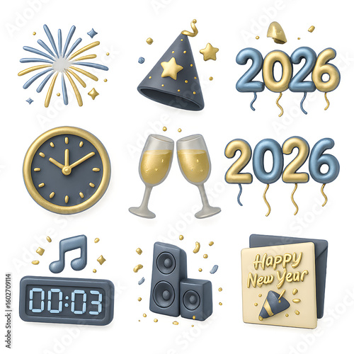3D illustration of A festive collection of 3D icons set for the New Year 2026 celebration, featuring a countdown clock, champagne, and party elements for a joyful holiday.