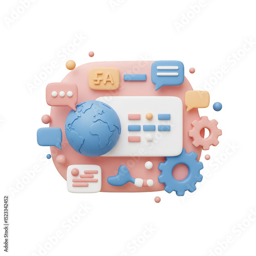 3D Illustration of Global Communication with Pastel Globe and Gears