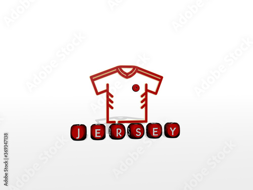 3D illustration of JERSEY graphics and text made by metallic dice letters for the related meanings of the concept and presentations. football and background