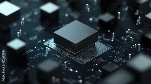 3D Isometric Illustration of Sleek Microchip Surrounded by Floating Abstract Digital Symbols Representing AI, Data, and Innovation