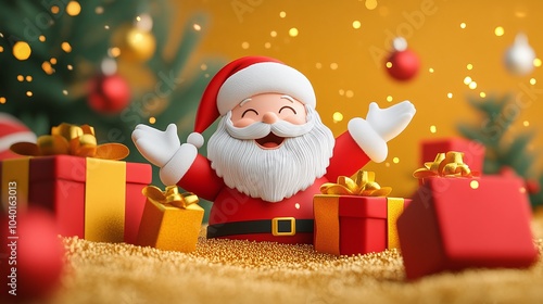 3D Joyful Santa in Festive Atmosphere with Gifts