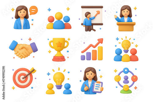 3D Leadership Icons. Leadership. 3D icons set of leadership: businesswoman speaking, team listening, leader pointing at chart, podium, handshake, award trophy,