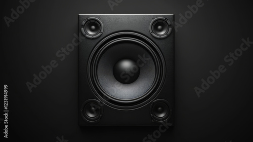 3d music loudspeaker. Stereo sound speaker system isolated icon. Black subwoofer equipment for acoustic studio. Party or movie electronic play set. Powerful cinema amplifier design. Radio device