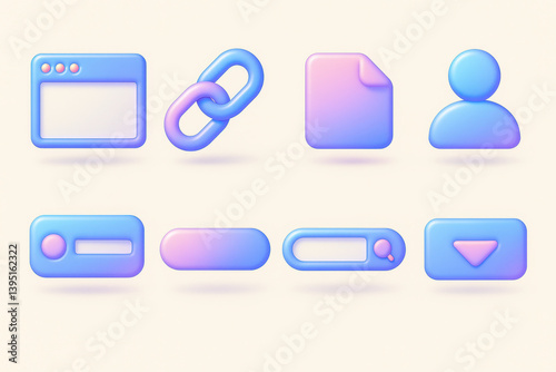3d pastel interface icon set featuring browser, link, file, user, button elements