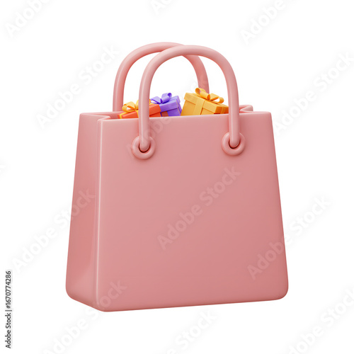 3D Plastic Shopping Bag Icon Filled with Vibrant Gift Boxes Isolated on Transparent Background