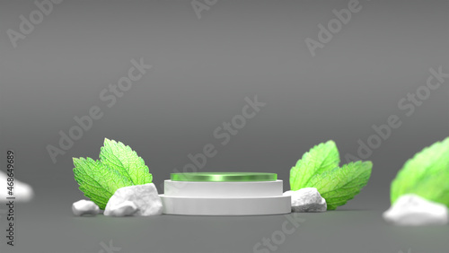 3d podium mockup background with green energy saving lamp sense and mint leaves