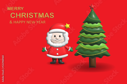 3D Realistic cartoon santa claus and christmas tree decorations with gifts winter holiday design elements isolated white