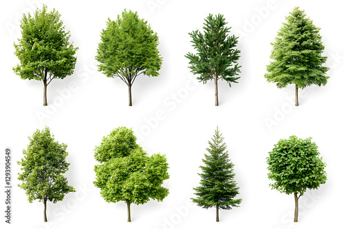 3d realistic green trees collection isolated on white background