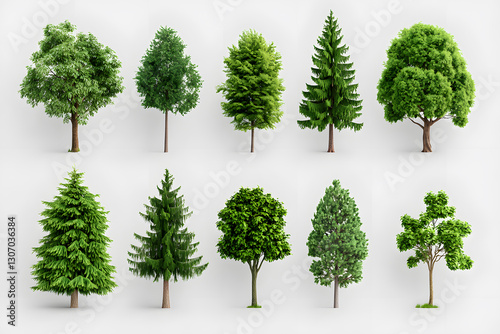 3d realistic green trees collection isolated on white background