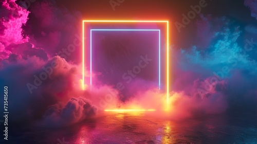 3d render, abstract cloud illuminated with neon light ring on dark night sky. Glowing geometric shape, round frame