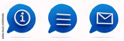 3d render icons. Symbol: information, menu, e-mail,. 3D illustration. Blue icon isolated on white background.