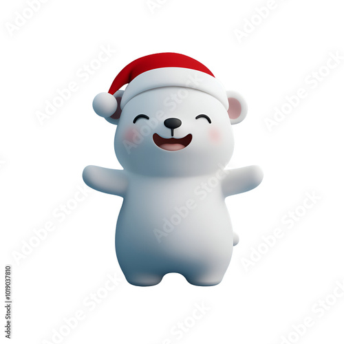 3D render illustration of a happy and cute polar bear wearing a Santa Claus hat, Christmas character cartoon, Isolated on Transparent Background, PNG