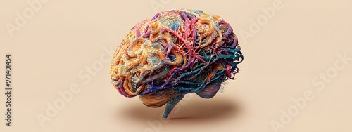3D render of a colorful brain with an intricate neural network, isometric view, beige background.