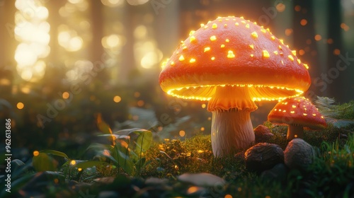 3D render of Amanita muscaria mushrooms in the forest, glowing with light, cartoon style, casual game art, cute 2d illustration, bright colors, soft lighting, dreamy atmosphere, high resolution