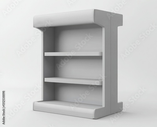 3D render of an empty grey cardboard stand with shelves for product advertising and promotional materials on a white background