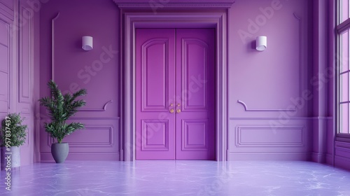 3D render of double doors opening in a light violet room. Architectural element isolated on a lilac background.