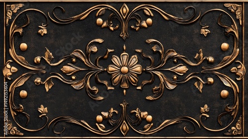 3D render of ornate, dark brown decorative panel with gold floral elements and geometric patterns.