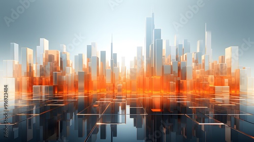 3D Rendered City Skyline with Orange, Gray, and Silver Theme, Abstract Futuristic Background, Glass Buildings, and Reflections