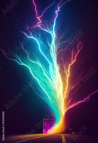 3D rendered computer generated image of colorful lighting storm. Electricity and polychromatic color make for a bright, vibrant artistic pattern great for backgrounds and wallpaper.